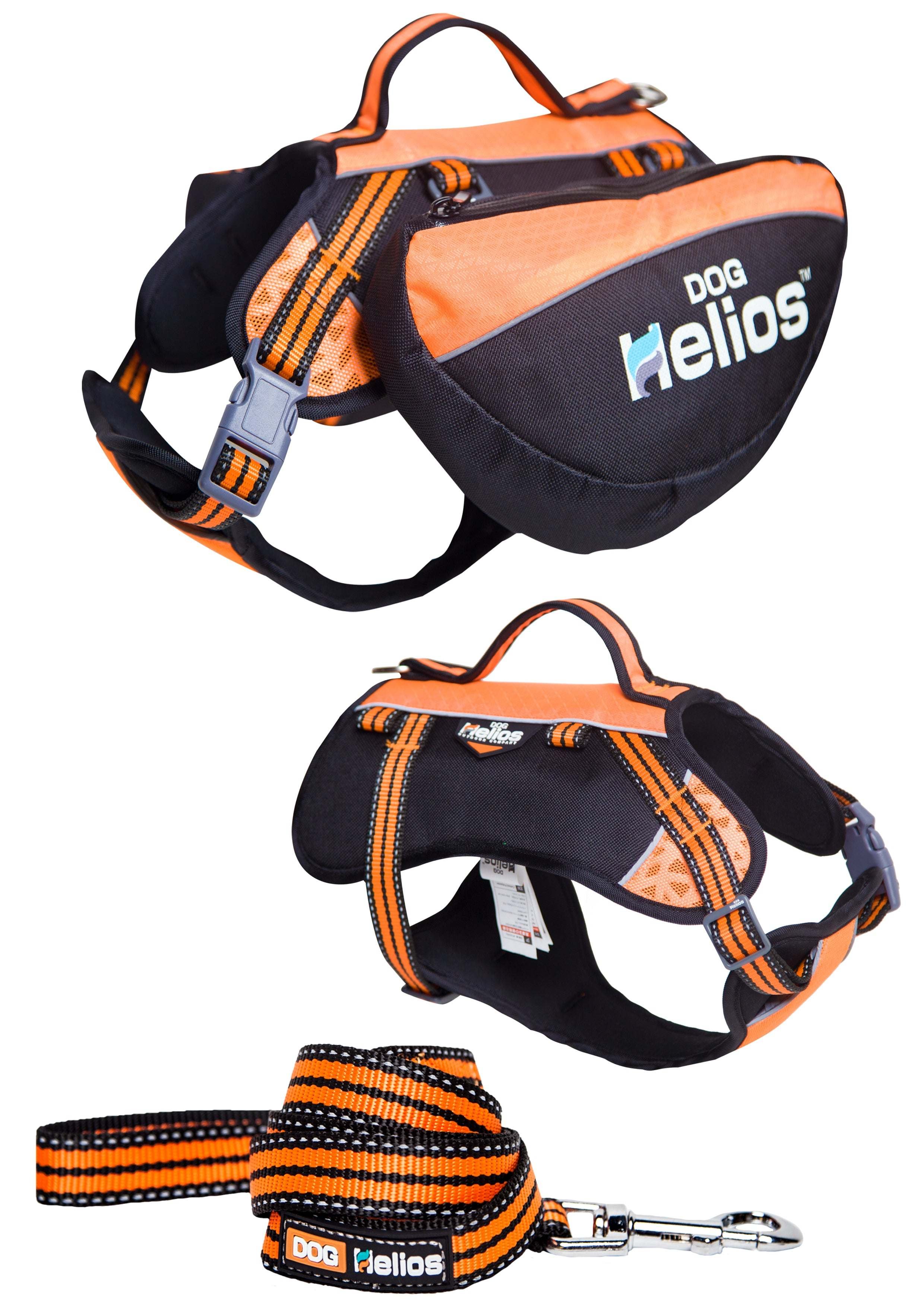 The Helios Dog Freestyle 3-in-1 Explorer Convertible Backpack, Harness and Leash is a Backpack that Doubles as a Chest Compression Harness with an Included Leash. This Only-of-its-kind 3-in-1 Backpack, Harness and Leash features a Backpack with a Chest Compressive Harness that completely ejects from the Backpack that enables the user to remove the backpack as the user wishes. The Backpack features a special DUPONT Outershell that is entirely Waterproof including the zippers. The Outershell of the Backpack further features reflective-tubed lining all around with added reflective memorized stitching along the DUPONT Nylon Outershell for premium protection during those night strolls. The Harness portion features both a Neoprene and Waterproof DUPONT Outershell with a breathable and visible cross-stitched inner mesh Outer and Inner lining for optimum comfort. The Chest Compression Harness is also fully adjustable and places little-to-no stress at the sternum area of the pets body for a comfortable pull. Comes with a matching accented Nylon leash with a Stainless steel swivel hook. Features Rubberized Stitching and Embroidery at the Leash, Backpack and Harness. Get Outdoors with Helios Dog! Available in Multiple Sizes and Colors.