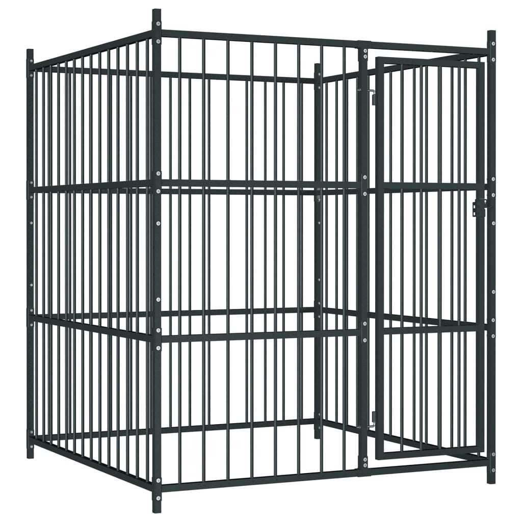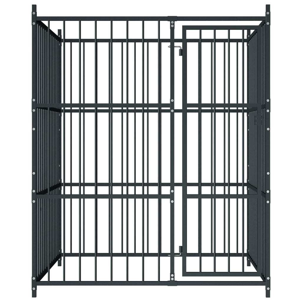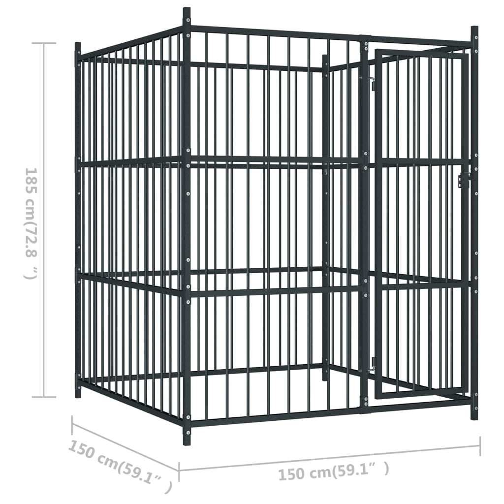 Our dog kennel is easy to assemble.Color: BlackMaterial: SteelOverall dimensions: 59.1" x 59.1" x 72.8" (L x W x H)Inner dimensions: 57.1" x 57.1" x 72.8" (L x W x H)Metal bar size: 1" x 1" (L x W)Ground surface area: 24.2 ft²Lockable latch systemSuitable for dogsAssembly required: Yes