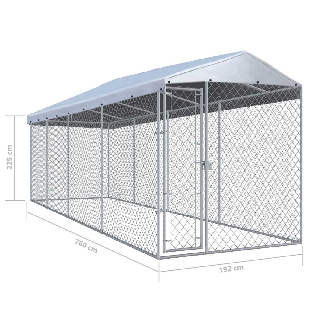 This large dog kennel provides ample exercise space while the chain link mesh all around helps prevent mischief and unexpected accidents, while enabling ventilation. Thanks to the sturdy and heavy-duty galvanized steel construction, this dog kennel is durable and built to last. The included top canopy, made of 100% polyethylene, is fire-resistant and UV protected, providing protection from sun, rain, snow and other weather conditions. The hinged door ensures extra security and safety for your dogs thanks to the lockable latch system. Assembly is really easy.Material: Galvanized steelRoof material: 100% PEOverall dimensions: 299" x 75.6" x 88.6" (L x W x H)Inner dimensions: 297.2" x 73.2" x 86.6" (L x W x H)Wall height: 176.8"Ground surface area: 157.2 ft²Lockable latch systemChain-link mesh sidewallsEasy to assembleSuitable for dogsCalifornia Proposition 65